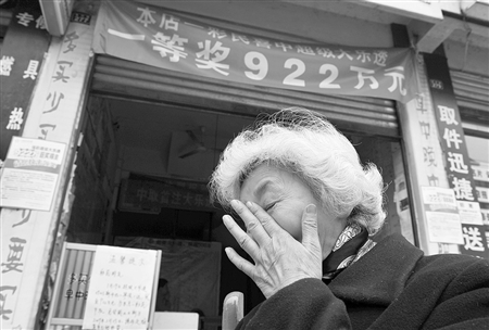 前晚24時,省體彩中心宣布922萬元大獎被棄領(lǐng),這起事件本已塵埃落定,但昨日事情又出現(xiàn)波折:盡管手上沒有中獎的那張彩票,也記不清楚中間的幾位數(shù)字,滿頭銀發(fā)的胡慧瓊昨日中午依然第3次來到都江堰景環(huán)路277號體彩銷售點,她堅信自己就是那位922萬元大獎的得主。