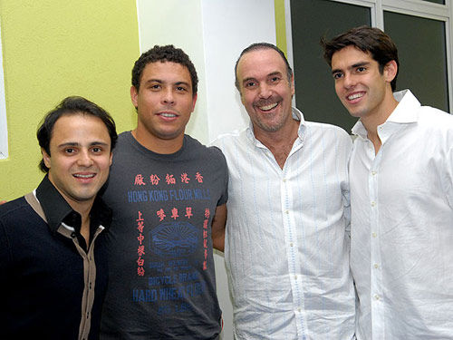 6 月10日是卡卡的兒子盧卡滿一周歲的日子,而當(dāng)天小盧卡的父親卻正跟隨巴西隊迎戰(zhàn)巴拉圭隊。為了彌補(bǔ)這個遺憾,上周日,卡卡特意在巴西圣保羅為兒子補(bǔ)辦了一個生日宴會,邀請了埃拉諾、羅比尼奧、F1車手馬薩和羅納爾多等100多名嘉賓參加。光臨現(xiàn)場的其他嘉賓都是盛裝出席,沒想到羅納爾多卻穿著一件夠“潮 ”的體恤“閃亮”出場!衣服正面橫著幾個中文大字:“香港面粉廠”,旁邊像對聯(lián)一樣地印著“上等中糧白粉、特殊工藝……”等字樣,搞笑之極。在那排“香港面粉廠”的文字下面還有三個中文“單車嘜”,肥羅在搞笑之余還不忘體育鍛煉。