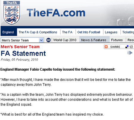 英格蘭主帥卡佩羅在英足總官網(wǎng)上的聲明中表示:“經(jīng)過(guò)深思熟慮后,我決定撤銷約翰·特里的隊(duì)長(zhǎng)職務(wù)。作為國(guó)家隊(duì)隊(duì)長(zhǎng),約翰·特里在場(chǎng)上的表現(xiàn)無(wú)可挑剔,但我要做出的決定更多的是為了整個(gè)英格蘭隊(duì)考慮。”