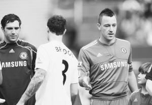 看臺(tái)上雙方球迷打出了支持各自球員的橫幅,與“特里之隊(duì)”相對(duì)的是“布里奇之隊(duì)”。開場(chǎng)后,布里奇和特里有過(guò)一次直接面對(duì)面的機(jī)會(huì)。特里在大禁區(qū)左側(cè)拿球,布里奇在防守他,雙方并沒有糾纏太久,特里草草射了一腳門了事。