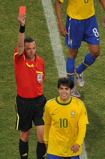這也是卡卡少有的紅牌。在7年前轉(zhuǎn)會到歐洲以后,卡卡從來沒有在比賽中因為犯規(guī)而被紅牌罰下。這也讓人想到了上屆世界杯,法國隊核心球員、另外一位世界足球先生齊達內(nèi)的表現(xiàn)。當(dāng)時在與意大利隊后衛(wèi)的對抗中,齊達內(nèi)也是隊對方后衛(wèi)馬特拉齊犯規(guī),導(dǎo)致吃紅牌被罰下。