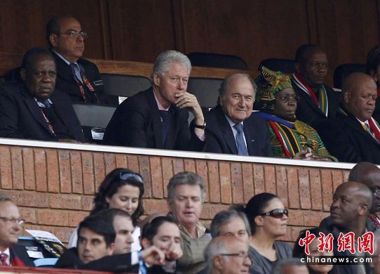 中新社比勒陀利亞6月23日電 23日下午,美國前總統(tǒng)比爾·克林頓與國際足聯(lián)主席布拉特,在比勒陀利亞洛夫托斯球場一同觀看了美國隊與阿爾及利亞隊之間的“生死之戰(zhàn)”。