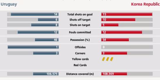 韓國(guó)隊(duì)在場(chǎng)上更加咄咄逼人,他們的犯規(guī)次數(shù)和烏拉圭隊(duì)都是12次,但是韓國(guó)隊(duì)因?yàn)榍址笇?duì)手吃到三張黃牌。烏拉圭隊(duì)有一次越位,兩隊(duì)的角球都是3個(gè),旗鼓相當(dāng)。