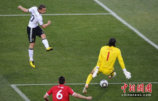 場上節(jié)奏開始加快,隨后格倫·約翰遜邊路傳中迪福的頭球打中橫梁,不過已經(jīng)越位在先。第32分鐘,德國隊(duì)卷土重來,打出漂亮的前場配合。穆勒接克洛澤挑傳突入禁區(qū),將球傳給了左邊路高速插上的波多爾斯基,后者小角度抽射打了詹姆斯一個(gè)穿襠,德國隊(duì)2-0領(lǐng)先。