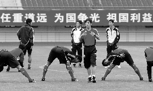 昨日上海驟然降溫,淅淅瀝瀝的小雨悄然而至,國家隊下午5時出現(xiàn)在訓(xùn)練場上,金山體育中心為國足打出“任重道遠(yuǎn)、為國爭光、祖國利益高于一切”的橫幅。主帥高洪波身穿紅衣短袖,而助理教練傅博、區(qū)楚良則身穿白底的運(yùn)動外套,在國家隊隊員的包圍中,甚至很難辨別出少帥之身份。國安隊及山東隊的6名隊員由于航班原因遲到,因此首堂訓(xùn)練課由25名隊員參與。由于國足隊員上周末剛打完職業(yè)聯(lián)賽,因此首堂訓(xùn)練課主要以恢復(fù)性訓(xùn)練為主。訓(xùn)練內(nèi)容從慢跑開始,隊員們并沒有成群結(jié)隊一同跑,而是三三兩兩地分開慢跑,鄭智、王新欣與周海濱分成一組,慢跑中隊員不時聊天談笑,氣氛顯得十分輕松,絲毫不覺聯(lián)賽過后的疲憊。隨后在傅博的帶領(lǐng)下,隊員分成三組進(jìn)行搶圈訓(xùn)練,高洪波則在一旁當(dāng)“監(jiān)工”。在訓(xùn)練尾聲,以高洪波領(lǐng)銜的教練組與國足一同慢跑,此次慢跑持續(xù)了超過20分鐘。一個半小時的訓(xùn)練結(jié)束后,山東魯能的4名隊員韓鵬、王永珀、吳昊及劉金東才姍姍來遲,此時助教傅博氣喘噓噓地喊隊醫(yī)尹煜華說:“拿著表,盯著他們跑20分鐘啊!币蠓蛑缓迷谟曛小蔼(dú)訓(xùn)”國腳。