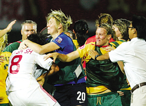 人在足球場,女子也瘋狂!8月3日晚上的武漢漢口體育場,在亞青賽中國隊(duì)與澳大利亞隊(duì)的比賽結(jié)束之后,溫文爾雅的女孩們也動(dòng)起了老拳,場上三四十人亂戰(zhàn)成一團(tuán),經(jīng)過亞足聯(lián)官員長達(dá)十分鐘的調(diào)解,事態(tài)才暫時(shí)得到平息。然而,心懷不滿的澳大利亞女足姑娘們,還意猶未盡,在回到更衣室后,她們瘋狂地拆卸了更衣室的衣柜,砸成一團(tuán)。而她們的教練也按捺不住心中的憤懣,在發(fā)布會(huì)上當(dāng)著眾多記者面,砸掉了手中的礦泉水瓶,險(xiǎn)些砸到一名中國記者。一場普通的比賽,以這樣的方式收場,看來,足球之亂,并非只在中國球員身上,也并非只是成年隊(duì)球員。