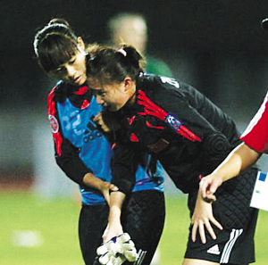 中澳比賽進(jìn)行到下半時(shí)后半段,屈珊珊后場開球拖延時(shí)間被黃牌警告。傷停補(bǔ)時(shí)階段,門將張?jiān)匠鰮羰軅蟮沟夭⒔邮荜?duì)醫(yī)進(jìn)場治療,此時(shí)澳大利亞球員杰西卡卻認(rèn)為中國隊(duì)隊(duì)醫(yī)故意拖延比賽時(shí)間,與中國隊(duì)員發(fā)生肢體沖突。印度主裁判本迪卡在與韓國助理裁判商量后,將澳大利亞隊(duì)杰西卡紅牌罰下,這引起了澳大利亞主教練的大大不滿。