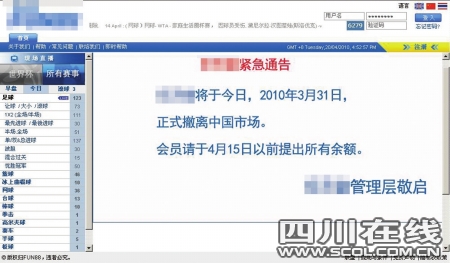 在另外一家博彩網(wǎng)站,同樣是存款界面,中國國內(nèi)借記卡的一欄已經(jīng)成了空白,付款只能通過點擊國外信用卡才可以進行,包括國內(nèi)雙幣信用卡也不能使用。此外,還有一家網(wǎng)站竟然掛出了公告,于“2010年3月31日正式撤離中國內(nèi)地”。