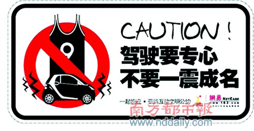 在剛剛結(jié)束的車展上,網(wǎng)易為推廣《亞運(yùn)文明公約》,特推出了一套以“孫悅車震事件”為主題的搞笑車貼向觀眾派發(fā)。車貼上寫著:駕駛要專心,不要一震成名,F(xiàn)場不少參觀者看到“孫悅車貼”后,都忍不住咧嘴偷笑。