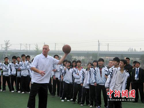 16日,NBA傳奇明星克里斯·穆林及NBA發(fā)展聯(lián)盟球員、北京奧神隊(duì)部分球員來到都江堰青城山高級(jí)中學(xué),與320名該;@球運(yùn)動(dòng)員一起進(jìn)行籃球訓(xùn)練活動(dòng)。雖然語言不通,學(xué)生們?nèi)栽诖笄蛐堑膸ьI(lǐng)下傳球、運(yùn)球、上籃,過足了一把NBA打球的癮。