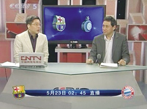 而屏幕下方顯示的字幕圖像居然擺了一個(gè)令人啼笑皆非的超級(jí)“烏龍”,在字幕上顯示決賽對(duì)陣雙方時(shí)居然出現(xiàn)巴薩的隊(duì)徽,對(duì)陣雙方并不是拜仁VS國(guó)米。用當(dāng)下網(wǎng)絡(luò)時(shí)髦的話來說,就是衛(wèi)冕冠軍巴薩“被”晉級(jí)了。這個(gè)大“烏龍”,相信眼尖的球迷都發(fā)現(xiàn)了。