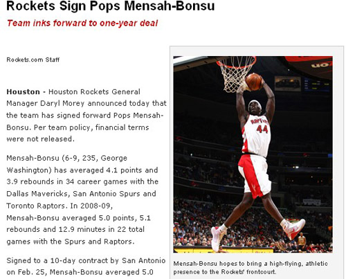 中新網9月4日電 北京時間今日,火箭官方宣布簽下英國內線波普-門薩邦蘇,他的非保障性合同為期一年。門薩邦蘇目前不能確定在火箭打完整個2009-10賽季。