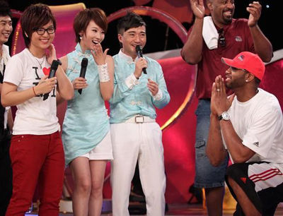 這不,在他結(jié)束中國(guó)行之前,安徽衛(wèi)視的一檔綜藝節(jié)目邀請(qǐng)麥迪和前超級(jí)女聲亞軍周筆暢一同參加節(jié)目,讓現(xiàn)場(chǎng)的觀眾大呼過(guò)癮。在節(jié)目現(xiàn)場(chǎng),當(dāng)?shù)弥矍斑@個(gè)較小的女孩竟然是中國(guó)的一位頗具實(shí)力的歌唱新星時(shí),麥迪想盡一切辦法希望能聽(tīng)到周筆暢的歌聲,包括表演了各種籃球技巧。當(dāng)然,為了回饋麥迪,周筆暢當(dāng)場(chǎng)獻(xiàn)上一曲《I Believe I Can Fly》。對(duì)于美國(guó)球員來(lái)說(shuō),這首歌是再熟悉不過(guò)的了,因?yàn)樗鼛缀跏菫榛@球飛人邁克爾·喬丹量身定制的。麥迪十分欣賞周筆暢的歌聲,而且一邊聽(tīng)還一邊不停揮舞雙手,連連稱贊道:“她有一副好嗓子,我祝福她今后可以發(fā)展得更好!” 之后,與麥迪同行的友人更是抱起周筆暢的腰將她托起來(lái)灌籃。這一舉動(dòng)讓周筆暢大感意外,對(duì)著歌迷說(shuō):“這可是我人生第一個(gè)大灌籃!” 。