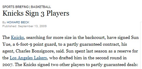 中新網(wǎng)9月14日電 北京時(shí)間昨日晚,《紐約時(shí)報(bào)》曝料稱(chēng):孫悅的經(jīng)紀(jì)人查爾斯·包辛諾透露,尼克斯已經(jīng)同中國(guó)球員孫悅簽訂了一份部分保障合同,補(bǔ)強(qiáng)球隊(duì)后場(chǎng)。