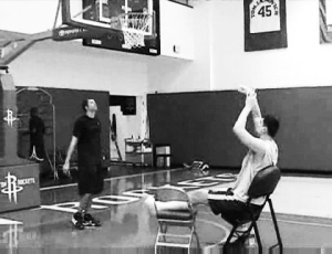 每天姚明都重復同樣的動作——坐車來到豐田中心,拄拐換乘擺渡車,拄拐來到訓練場,然后由甘寧幫他搬兩把椅子,一把給姚明坐著,一把給他放左腳。這兩把椅子每天要被擺在三個地方:正對籃下大約在罰球區(qū)的位置和兩個45度角。在每個位置上,姚明要進行100個投籃練習,每組投25個,分4組完成每個點的訓練量。