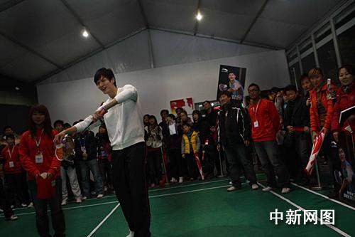 中新網(wǎng)上海十一月二十三日點(diǎn)(宗晨亮)日前,中國(guó)羽毛球名將鮑春來來到“2009李寧・中國(guó)羽毛球公開賽”球迷體驗(yàn)區(qū),和球迷們進(jìn)行了互動(dòng)活動(dòng),還為大家簽名留念。有意思的是,小鮑的球迷多數(shù)都是女性,主持人也拿此事和他開玩笑。