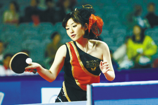在眾多參賽選手中,日本女選手四元奈生美屬于“另類嘉賓”。32歲的四元奈生美在日本乒壇名氣很大,在國內(nèi)錦標(biāo)賽中,很多球迷都是因她而買票入場看球的,她所吸引球迷的“武器”并非球技,而是獨(dú)特的打扮。