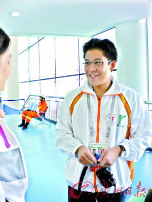 在十一運游泳比賽的第一天,賽場內(nèi)的焦點是劉子歌、焦劉洋和張琳這3位世界冠軍。比賽剛開始,看臺上已經(jīng)座無虛席。記者就坐在香港隊隊員旁邊,就在男子 400米自由泳預賽開始時,香港隊隊員們紛紛拿出了數(shù)碼相機,記者以為他們是要拍正在比賽的世界冠軍張琳,但只見隊員們輪流換座位,要求坐到一個帥氣的男生身邊與之合影。記者上前一看,這個“明星”胸前的VIP證件上寫著“香港代表團霍啟剛”。