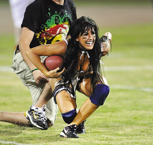 2009年,美國女子內衣橄欖球大聯(lián)盟(簡稱LFL)正式誕生,聯(lián)盟由10支球隊組成,球隊選拔隊員時不求最壯只求最靚,球員是清一色的性感美女。一群身材火爆的辣妹,穿著讓人“流鼻血”的性感內衣在場上肉搏美式足球,讓人大飽眼福的運動今年9月4日開打,頂著金融危機的風險,這項停辦兩年的比賽終于得以再度舉行。