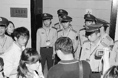 郭晶晶是否真的去找吳敏霞了?這個(gè)記者并不清楚,不過(guò)據(jù)記者了解吳敏霞不出席新聞發(fā)布會(huì)是因?yàn)楹ε卤弧罢`傷”。在郭晶晶第一次離開(kāi)新聞發(fā)布會(huì)現(xiàn)場(chǎng)時(shí),記者也跟了出去。吳敏霞當(dāng)時(shí)剛剛接受完央視的采訪正準(zhǔn)備走進(jìn)更衣室,但此時(shí)竟然有一位簽名的男FANS跟著吳敏霞走進(jìn)了更衣室,不過(guò)好在現(xiàn)場(chǎng)武警反應(yīng)迅速,將他“揪了”出來(lái)。見(jiàn)現(xiàn)場(chǎng)形勢(shì)已經(jīng)非常混亂,武警索性集體站在了女更衣室的門口,一位現(xiàn)場(chǎng)工作人員邊打著電話,邊嚷著“守好,誰(shuí)都不讓進(jìn)去”。