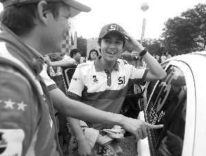 韓寒的支持者顯得更加有組織性,在昨天的發(fā)車現(xiàn)場,記者甚至看到了幾位打著“南京寒迷會”橫幅的帥哥美女,不過韓寒似乎有點不太“合作”,直到發(fā)車儀式即將開始的時候,才出現(xiàn)在自己的賽車旁,這讓現(xiàn)場的韓迷頗有些失望。