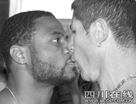 賽前,兩位火爆的拳王互相用口水戰(zhàn)為自己打氣,衛(wèi)冕拳王帕斯卡爾自信地喊道:“我不會花太長時間擊倒他,所以不要來晚了。”并揚言要將對手布蘭科打成“血醬”。隨后,帕斯卡爾還挑釁地同布蘭科鼻對鼻的對峙,不過,由于兩人挨得太緊、過于“親密”,讓火藥味十足的對峙變成嘴對嘴的曖昧,讓人忍俊不禁。記者陳甘露
