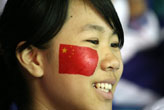 亞運(yùn)會(huì)舉重賽場(chǎng)的看臺(tái)上,孩子們臉上貼著亞運(yùn)標(biāo)志觀(guān)看比賽。