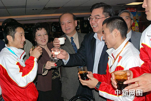 慶功會自始自終洋溢著喜慶熱烈的氣氛。在慶功會上,僑胞代表們紛紛與金牌獲得者鄒市明、銅牌獲得者李洋、哈那提斯拉木、尼加提玉山、張志磊等運(yùn)動員們合影留念,賓主頻頻舉杯共祝2008年再創(chuàng)輝煌。