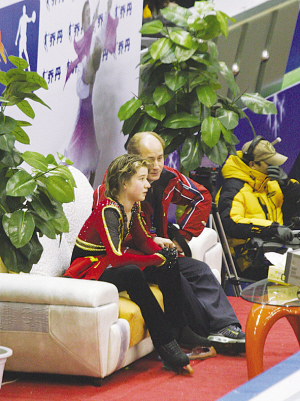 紅黑的緊身衣鑲著亮亮的水鉆,賽場上,小米沙充滿張力的表演酷似“俄羅斯冰上王子”普魯申科!捌蒸斏昕?他是我的偶像,不過也是我父母的好朋友。他還親自教我呢!备昝咨车靡獾卣f道。