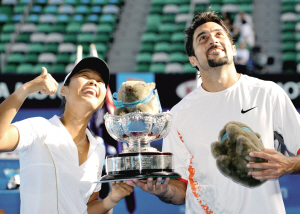 在2008澳網(wǎng)最后的決戰(zhàn)日,中國金花孫甜甜幸運(yùn)地舉起了冠軍獎(jiǎng)杯,她和塞爾維亞選手澤蒙季奇搭檔在混雙決賽中贏得了勝利。孫甜甜為中國女網(wǎng)贏得了第三座大滿貫冠軍獎(jiǎng)杯,而澤蒙季奇則為塞爾維亞奪取了首個(gè)大滿貫冠軍。