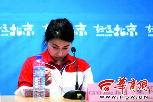 前晚決賽結(jié)束后,在運(yùn)動(dòng)員必須經(jīng)過的混合采訪區(qū),郭晶晶穿著泳衣出現(xiàn)在記者面前。很顯然,相比別的隊(duì)員穿戴整齊,郭晶晶更有理由早些離開。當(dāng)有記者問到誰(shuí)可能是郭晶晶在北京奧運(yùn)會(huì)上的有力競(jìng)爭(zhēng)者時(shí),郭晶晶沒有說到隊(duì)友——剛剛獲得金牌的吳敏霞,而是答道:“俄羅斯的帕卡琳娜和加拿大那個(gè)胖子(哈特莉)!庇蒙眢w特征來(lái)指代別國(guó)運(yùn)動(dòng)員,顯然缺乏禮貌!扒懊婺阋舱f了,新跳板對(duì)你有些影響。就你今晚的問題來(lái)說,新跳板影響有多大呢?”就此前郭晶晶說自己不適應(yīng)水立方新跳板的說法,新聞發(fā)布會(huì)上有記者希望她介紹更為詳細(xì)的情況!澳憔唧w說說我出了什么問題?難道我出了什么問題嗎?我覺得我表現(xiàn)得還可以。跳板是死的,人是活的,人總是要去適應(yīng)跳板的。”郭晶晶如此回答。