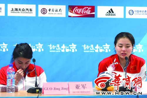 “你是國(guó)家隊(duì)目前年齡最大的選手,而你這次比賽三次失利都是難度最大的107B,是不是年齡大了對(duì)你完成難度大的動(dòng)作有些影響呢?”有記者問。郭晶晶猶豫了一下說:“我真不知道怎么回答你的問題。我覺得我今天整個(gè)表現(xiàn)挺好的。謝謝你!”比賽中得到銀牌的郭晶晶對(duì)隊(duì)友吳敏霞的比賽評(píng)價(jià)也很特殊:“她今天跳得特別好,簡(jiǎn)直神了!彪S后又說:“她在后面跳比較吃香。按理說后面跳的壓力更大,但后面的裁判給的分?jǐn)?shù)會(huì)比前面好一些,因?yàn)槭亲詈笠粋(gè)嘛。”
