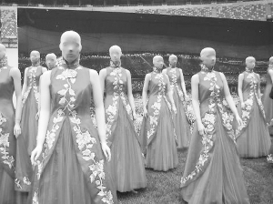 2008奧運(yùn)會、殘奧會開閉幕式服裝道具展日前在鳥巢舉行,但模特的造型很“雷人”,清一色以肉色絲襪蒙面,很像劫匪。每個模特腳下都堆疊著沙包,但堆得亂七八糟。