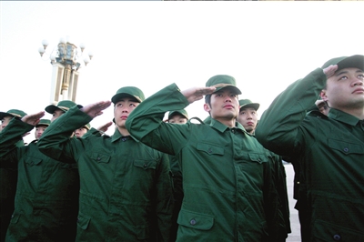 接受了4天的軍訓后,國羽將士們昨天在天安門廣場展示了自己的訓練成果——在寒風中列隊觀看了升旗。