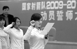 昨天下午,新一屆中國射箭隊(duì)在廣州黃村基地進(jìn)行了動員大會。在射運(yùn)中心主任高志丹,副主任王義夫和總教練田渝陵的帶領(lǐng)下,北京奧運(yùn)射箭金牌得主張娟娟代表運(yùn)動員宣讀誓詞,射箭隊(duì)全隊(duì)面對國旗誓師。