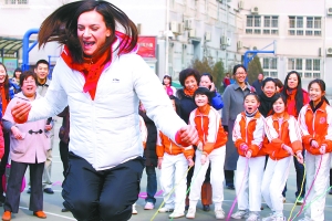昨天,曾26次打破世界紀(jì)錄的俄羅斯撐桿跳運(yùn)動員伊辛巴耶娃應(yīng)邀來到史家胡同小學(xué)分校,指導(dǎo)學(xué)生們撐桿跳的基本技能,并饒有興致地學(xué)起跳繩、抖空竹、滾鐵環(huán)等趣味體育活動。