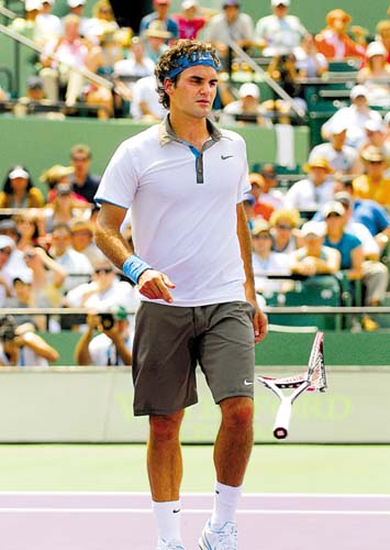 在今晨進(jìn)行的邁阿密索愛公開賽男單半決賽中,費(fèi)德勒摔拍了———在決勝盤第3局再次打丟一個機(jī)會球后,他將球拍往地上重重一砸、拍子立馬報(bào)廢。