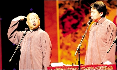 德云社的張德武、劉源以新編相聲《成長(zhǎng)的煩惱》開場(chǎng),他們拿馬諾在《非誠(chéng)勿擾》中經(jīng)典的“寧愿坐在寶馬車?yán)锟,也不坐在自行車后面笑”砸掛,現(xiàn)場(chǎng)效果很好。郭德綱、于謙登臺(tái)合說了《夸住宅》,干脆利落的貫口贏得陣陣喝彩。走下臺(tái)的郭德綱說,搭檔于謙給了他不少驚喜,很多臨時(shí)發(fā)揮的話接得很到位。