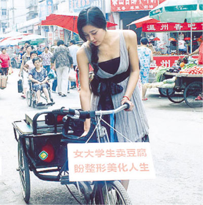 中新網(wǎng)7月23日電 “女大學(xué)生賣豆腐,許昌老豆腐,新鮮美味好吃不貴!”前天上午,河南鄭州市法院西街一個(gè)街市內(nèi),一名打扮時(shí)尚、樣貌酷似范冰冰的美女推著三輪車沿街叫賣豆腐,引得眾人圍觀。她說(shuō)從小就想做演員,但試鏡公司嫌她眼睛不好看、胸小,她希望藉賣豆腐“炒作自己,掙錢(qián)整容”。