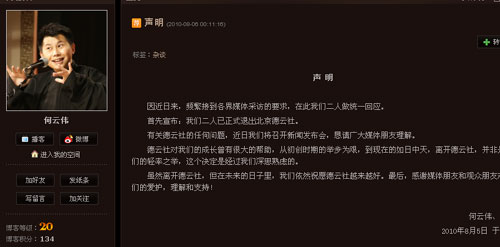 中新網(wǎng)8月6日電 今天凌晨,相聲演員何云偉在其個人博客上發(fā)表聲明,稱已和李菁一起正式退出德云社。在其聲明中,并未提及退出德云社的理由,不過何云偉表示,二人近期將舉行新聞發(fā)布會,向公眾說明情況。