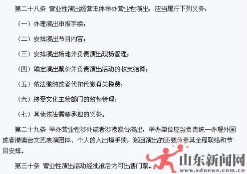 根據(jù)我國09年出臺(tái)的最新《營業(yè)性演出管理?xiàng)l例實(shí)施細(xì)則》第二十八條規(guī)定,營業(yè)性演出經(jīng)營主體舉辦營業(yè)性演出,應(yīng)當(dāng)履行辦理演出申報(bào)手續(xù)、安排演出節(jié)目內(nèi)容、接受文化主管部門的監(jiān)督管理等義務(wù)。緊接著,第三十條規(guī)定,營業(yè)性演出活動(dòng)經(jīng)批準(zhǔn)后方可出售門票。在《細(xì)則》中還明確指出,跨省區(qū)演出的,應(yīng)當(dāng)出具其他演出所在地省級(jí)文化主管部門的審核意見。