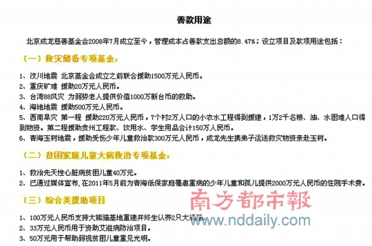 北京成龍慈善基金會(huì)成立于四川地震后2008年7月,旨在幫助捐款人成龍及其他所有捐款好友并監(jiān)管各類善款。這次捐款風(fēng)波的發(fā)生,北京成龍慈善基金會(huì)成為關(guān)注焦點(diǎn),善款去向也成為許多人期望了解的內(nèi)容。昨天,該基金會(huì)官網(wǎng)上“善款用途”欄目中,一筆歸為救災(zāi)儲(chǔ)備專項(xiàng)基金的“汶川地震北京基金會(huì)成立之前聯(lián)合援助1500萬元人民幣”引起人們關(guān)注,有媒體對(duì)比先前公開資料,發(fā)現(xiàn)2008年5月13日成龍與楊受成曾以成龍、楊受成基金的名義聯(lián)合捐助了1000萬,而另外的500萬捐助卻無跡可尋,在官網(wǎng)上也并無清晰的說明。因此有關(guān)500萬的下落追蹤又引出了新的爭議,對(duì)此黨群向南都記者解釋道,這筆500萬元屬于聯(lián)合捐助款項(xiàng),“這些錢都是在基金會(huì)成立之前(捐獻(xiàn))的,所以沒有走基金會(huì)(這邊的程序)。之前媒體報(bào)道的是那一大筆錢(指成龍、楊受成聯(lián)合捐助的1000萬),那一小筆(指500萬)沒有報(bào)道過,這筆錢采用的方式用途等統(tǒng)統(tǒng)也沒有對(duì)外透露,當(dāng)時(shí)是計(jì)劃等(項(xiàng)目)全部確實(shí)做成了才宣布。”