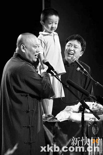 整場演出持續(xù)了近4個小時,全場笑聲、掌聲、喝彩聲不停,觀眾都說這次壓軸出演的老郭很“給力”。被要求返場后,郭德綱竟然把云字輩最小徒弟、于謙的兒子抱上桌子,用巧克力引誘他唱曲。結(jié)果小家伙上來就自選了一段《我是一個兵》,老郭又借著表示誰侵略我們就給打過去,還和小家伙合唱了一句太平歌詞。