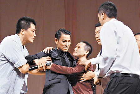 中新網(wǎng)9月21日電 電影《通天神探狄仁杰》前晚在北京大學(xué)舉辦首映,劉德華(華仔)、劉嘉玲、李冰冰、梁家輝都到場,活動進行到一半,有位男粉絲竟沖上臺熊抱華仔,被保安強行拉下臺,華仔見狀連忙斥喝保安,要他們動作不要太粗暴,展現(xiàn)巨星風(fēng)范。