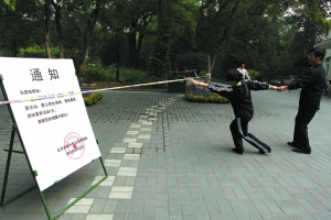 昨日,《非誠(chéng)勿擾2》劇組在紫竹院公園的拍攝進(jìn)入第二天。上午9時(shí),記者從東門進(jìn)入公園,一大片綠地上拉起警戒線,不時(shí)有劇組人員進(jìn)入。綠地內(nèi)搭起的白色棚子下,擺放著木椅及鋼琴等。據(jù)了解,此處將拍攝露天宴會(huì)的場(chǎng)景。一些平日在公園晨練的附近居民,昨日改在東門外活動(dòng)。晨練者們說(shuō),他們固定的活動(dòng)區(qū)域前天被拍戲占用,以為今天能恢復(fù),不料仍被占用。