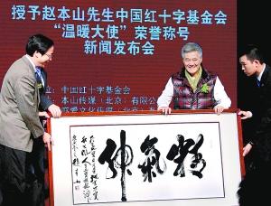 儀式現(xiàn)場(chǎng),趙本山還向紅十字基金會(huì)捐贈(zèng)了一幅自己的書(shū)法作品,雙方商定這件作品將于11月4日在“2010馬拉多納溫暖中國(guó)行”的慈善嘉年華晚會(huì)上進(jìn)行拍賣,拍賣所得用于建立溫暖中國(guó)行動(dòng)定點(diǎn)醫(yī)院和貧困腫瘤患者的救治。溫暖中國(guó)行動(dòng)辦公室主任齊中祥向趙本山遞交了這場(chǎng)慈善嘉年華的邀請(qǐng)函,趙本山愉快地接受了邀請(qǐng),并表示還將攜弟子現(xiàn)場(chǎng)奉獻(xiàn)精彩節(jié)目,屆時(shí),“馬大帥”趙本山與另外一位“馬大帥”馬拉多納將相會(huì)于北京。記者金力維