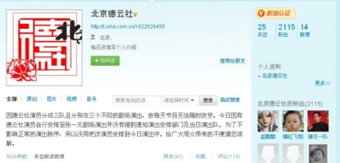 德云社在微博指出:“因德云社演員分成三隊(duì)且分別在三個(gè)不同的劇場演出,故每天節(jié)目無法隨時(shí)改變。今日因有德云社演員自行安排至張一元?jiǎng)鲅莩霾]有提前通知演出安排部門及當(dāng)日演出隊(duì)。為了不影響正常的演出秩序,所以沒用把該演員安排到今日演出中!