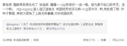 @veggieg:完了 聽說郭老師來圍脖界圈地了 浮云社堪憂啊~轉(zhuǎn)念一想 織圍脖這么女紅滴干活 郭老師還真不一定有那么細(xì)的針腳~ 呵~