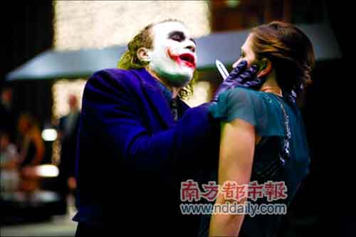小丑一邊撥弄“英俊”的發(fā)型手拿小刀走向蝙蝠俠的女友,猥瑣地舔著舌頭打招呼:“你好美啊。你看上去有點(diǎn)緊張!憋@然,蝙蝠俠又遇到了一個(gè)很討厭的情敵。鏡頭一轉(zhuǎn),小丑終于和蝙蝠俠打上了。蝙蝠俠駕駛摩托戰(zhàn)車,小丑手持機(jī)關(guān)槍,在街頭單挑,一輛貨柜車被掀翻,爆炸,小丑囂張奸笑,瘋狂享受戰(zhàn)爭。《蝙蝠俠:黑暗騎士》將于7月18日北美上映。