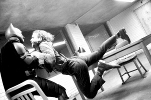還是在審問期間,“蝙蝠俠”和“小丑”互相糾纏在一起,前者的雙手掐住了后者的頭頸。當時采取了不同機位拍攝特寫,從一個角度來看,“小丑”從“蝙蝠俠”的手臂下方抓住他,但從另一個角度來看,“小丑”的手臂卻占據(jù)了上風,搭在“蝙蝠俠”手臂之上。